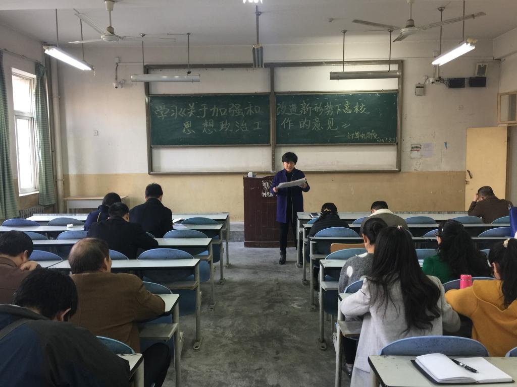 近日,中共中央、国务院印发了《头号玩家娱乐app官网加强和改进新形势下高校思想政治工作的意见》(简称《意见》)。3月3日下午,龙八头号玩家官网党总支书记刘晋云带领全体教职工学习《意见》的有关内容和精神。