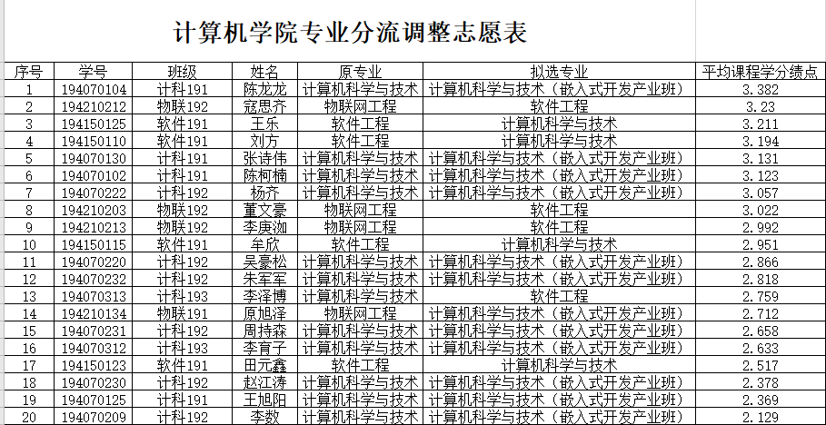 根据《计算机大类培养专业分流工作实施办法(试行)》文件要求,现将符合分流专业调整条件的名单予以公示,公示期为2021.7.22-2021.7.29,如有异议,须在公示期内以班为单位汇总向学生科反馈。