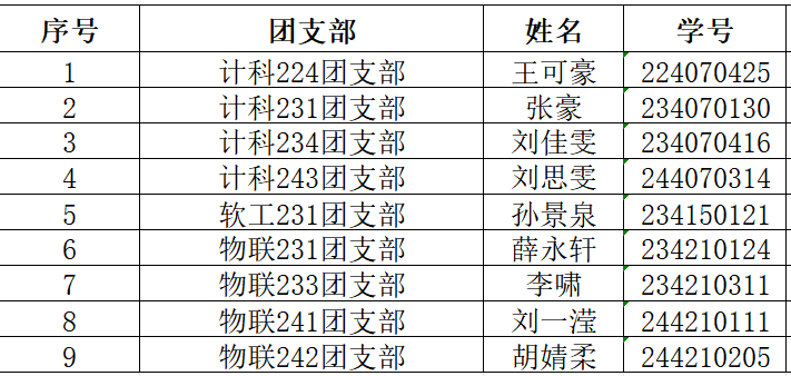 为进一步规范共青团管理工作,切实加强团的自身建设,根据《头号玩家娱乐app官网加强新形势下发展团员与团员管理工作的意见》、《中国共产主义青年团发展团员工作细则》等文件精神,按照“坚持标准、控制规模、发挥作用”的总要求,经各团组织评选,团总支审核,拟推荐王可豪、张豪等9名同学为新发展团员,现将名单公示如下: