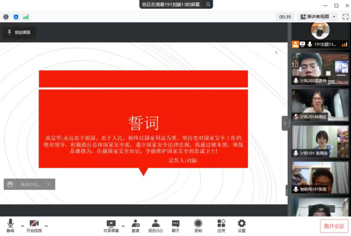 随后,围绕“国家安全与我”,师生党员代表结合疫情防控形势、社会安全、政治安全、文化安全和网络安全等方面,交流了学习习近平总书记头号玩家娱乐app官网总体国家安全观重要论述的心得体会。大家一致表示,在新冠肺炎疫情肆虐的严峻时期,这个全民国家安全教育日显得尤为重要。维护国家安全不仅仅是专门机关的任务,而是所有国家机关、社会组织和公民的义务和职责。在疫情防控中,每一名党员更应该履行好自己的职责,坚守在自己的岗位中,自觉践行总体国家安全观,筑牢国家安全防线。最后,全体师生党员庄严宣誓:永远忠于祖国、忠于人民,始终以国家利益为重,坚持党对国家安全工作的绝对领导,积极践行总体国家安全观,遵守国家安全法律法规,练就过硬本领,锤炼品德修为,传播国家安全知识,争做维护国家安全的忠诚卫士!
